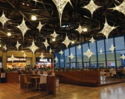 We offer a wide range of top quality, commercial grade, spectacular light displays to accent your property or city’s light poles during the holiday season! This festive 10′ 2″ Shooting Star pole decor is illuminated with warm white LED rope lighting and accented with shimmering red carpet garland.