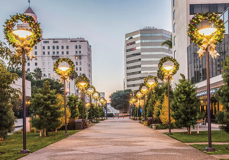 Our 60″ Silhouette Wreaths with 9′ Mountain Pine Garland Wrap are the perfect way to add festive flair to your outdoor lamp posts this holiday season. Adorn each side of the wreath with the two (2) included 24″ Red Structural Bows. Illuminated with (60) C7 LED Bulbs. Â