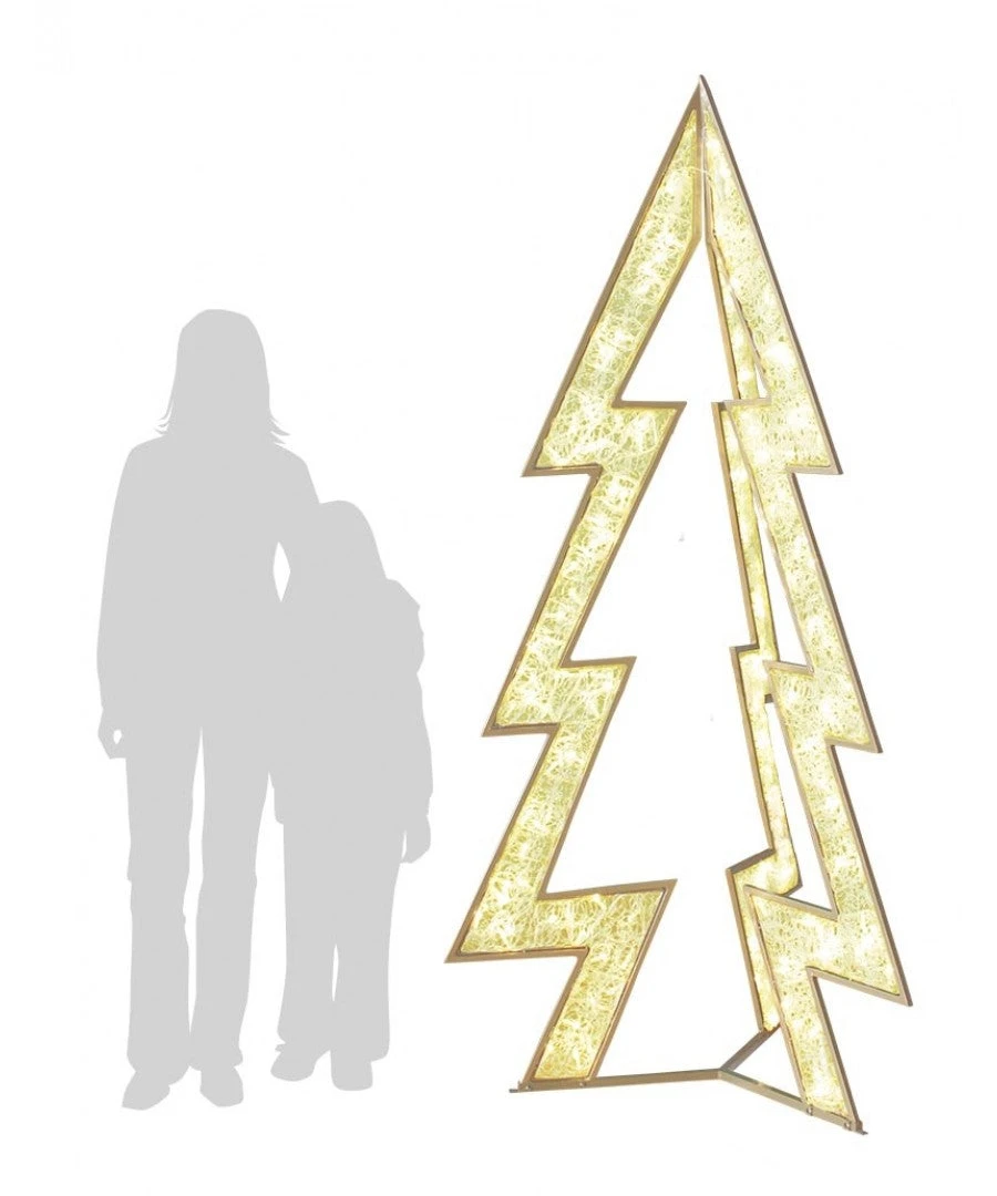 The modern yet simplistic tree is a fun addition to any décor program or holiday display. The tree is constructed with a gold frame and filled in with bright twinkling warm white LED mini lights woven through a clear silicone netting.
