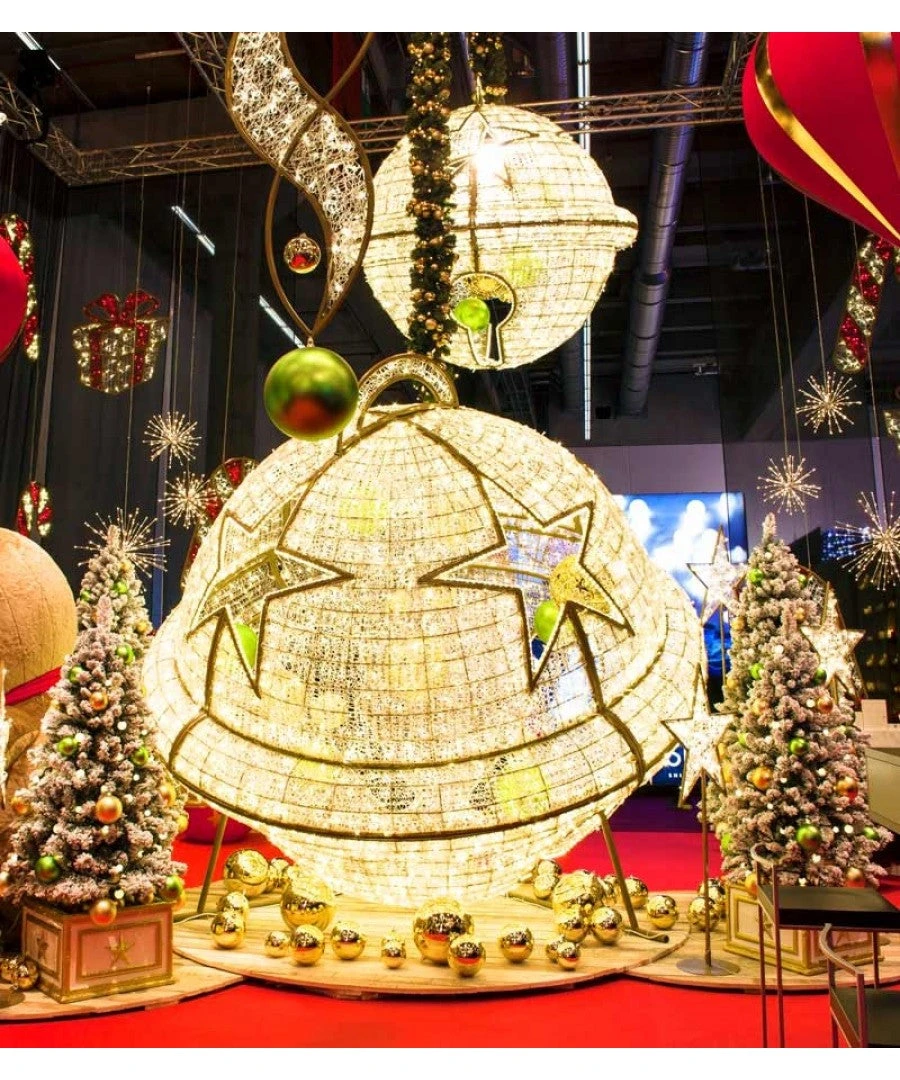 The eye-catching 7.2 ft LED Ornament display is an impressive holiday addition to any location and makes a perfect selfie backdrop or overhead decor enhancement! This dazzling ornament is constructed with a durable golden frame and covered with warm white LED mini lights woven through a clear silicone netting. Â