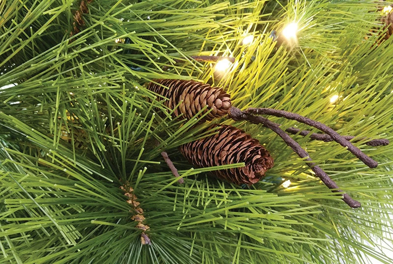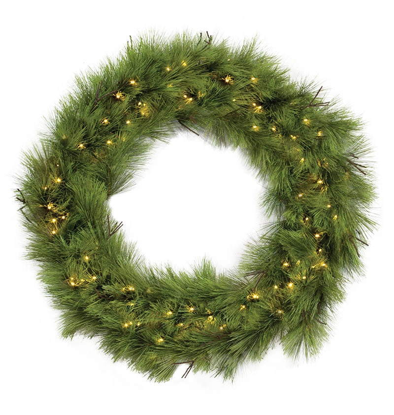 Our Bristle Pine Wreath is a commercial grade wreath perfect for a building front or other outdoor setting.  These wreaths are available in two sizes and constructed on a powder-coated metal frame that is covered with lush, 20″ Bristle Pine Garland and pre-lit with warm white LED miniatures. Â