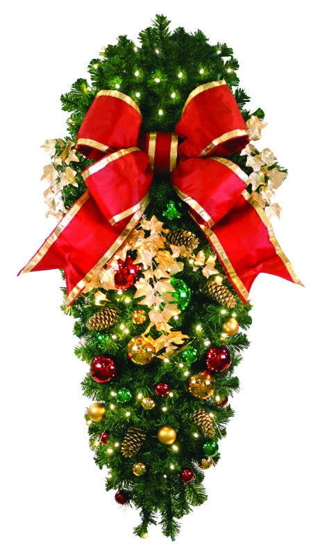 Pine Garland Spray with 18″ red structural bow with gold trim. Warm white LED miniature lights provide added holiday dazzle.