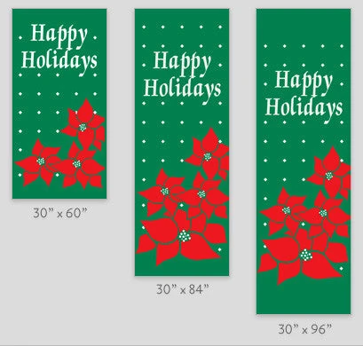 Happy Holidays! A full-color screen print featuring white and green inks on sea grass green marine acrylic fabric. Double-sided, same art both sides. Available in the following sizes as a stock item: