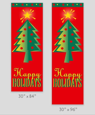 Festive screen print featuring yellow and green inks on red marine acrylic fabric. Double-sided banner; same art both sides. Available in the following sizes as a stock item: