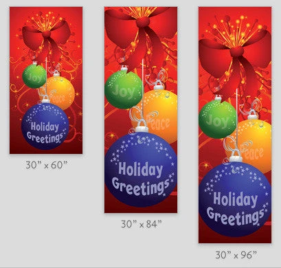 Holiday Greetings! A full-color digital print on 18 oz. reinforced vinyl. Double-sided banner; same art both sides. Produced on demand in the following sizes as a stock item:Â