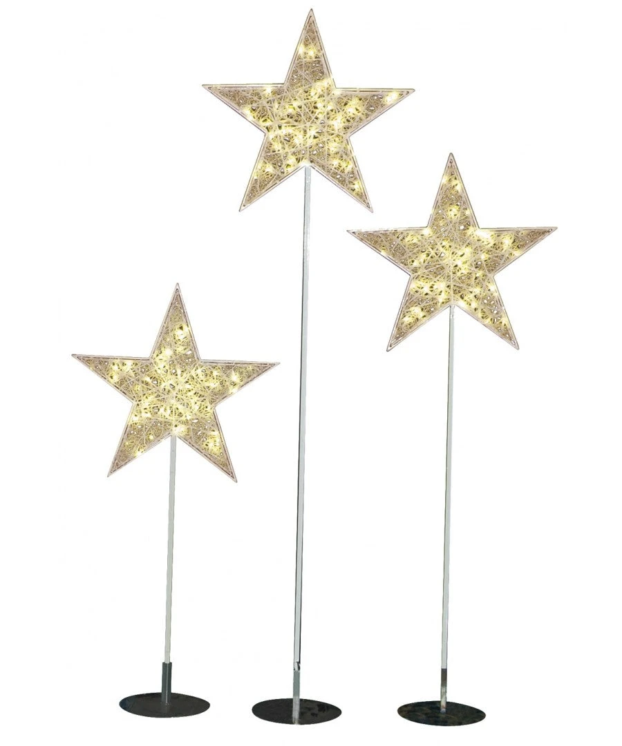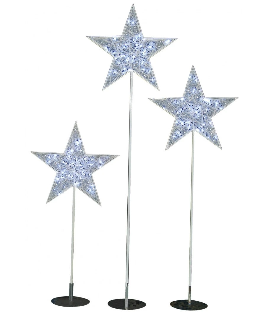 LED illuminated star decor in a set of three sizes: 4.6′, 6.1′, 7.5′. Built with cool white or warm white LED mini lights on a light-weight metal frame with stand. Suitable for interior or exterior decor use.
