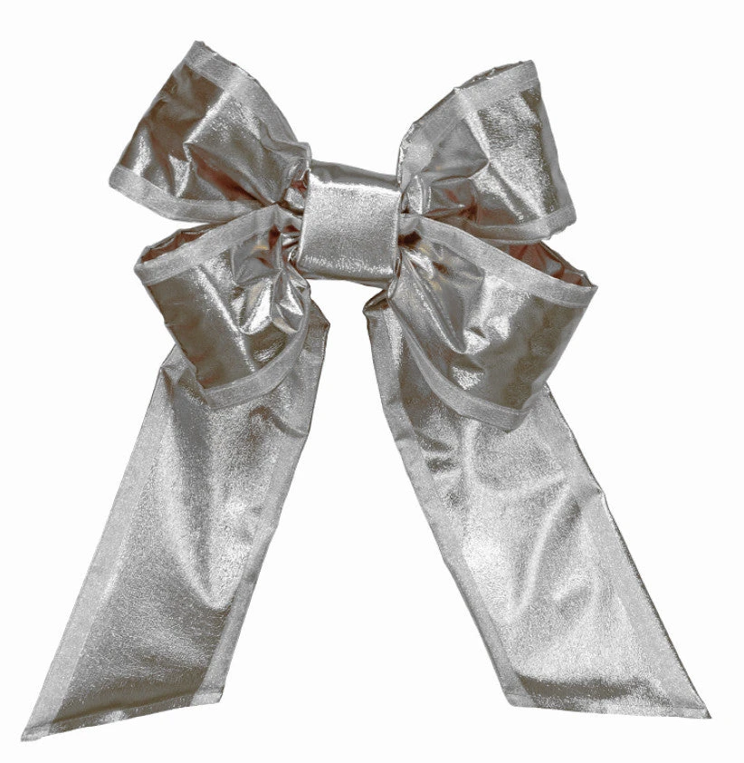 This premium structural bow is beautifully crafted in shiny Silver mylar. Proudly fabricated in the USA, this bow is made to provide years of use in demanding commercial settings. Structured around a bendable linked wire frame, this bow comes complete with tie-on straps for interior and exterior applications. Available in your choice of No Trim, Silver Metallic Trim or Gold Trim.