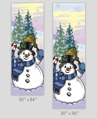 Snowman with Broom. A full-color digital print on 18 oz. reinforced vinyl. Double-sided; same art both sides. Produced on demand in the following sizes as a stock item:Â